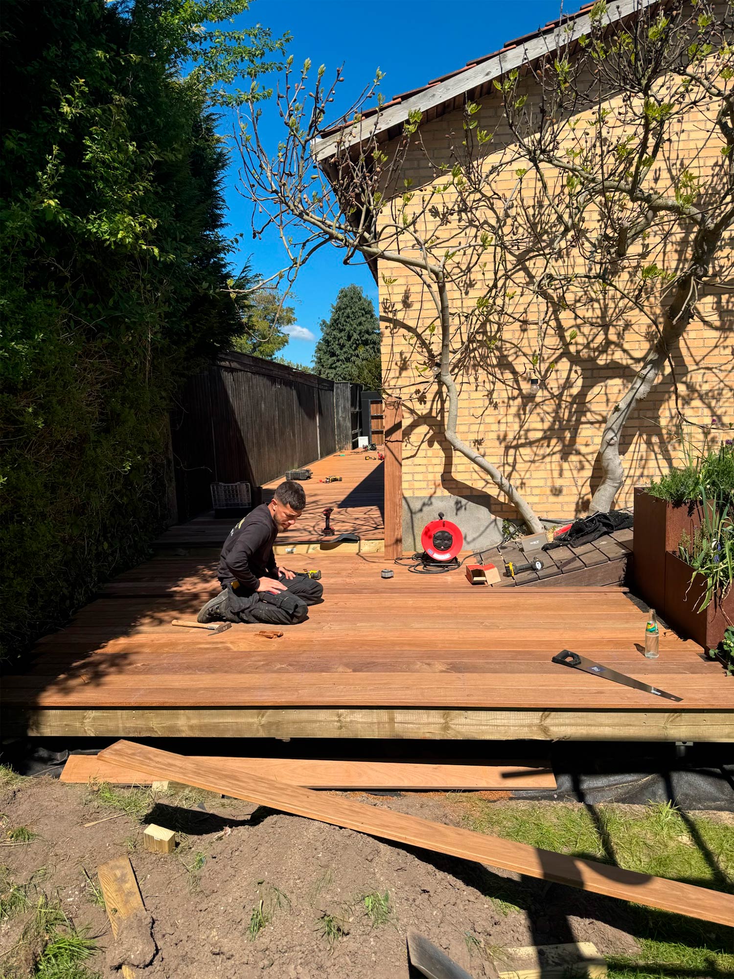 Kunden fik en flot terrasse, der strækker sig langs hele husets side og skaber et hyggeligt loungeområde bag carporten. Terrassen blev samtidig forbundet med deres eksisterende terrasse i baghaven, som vi havde bygget året før – alt i samme træsort for et smukt, gennemført helhedsindtryk.
